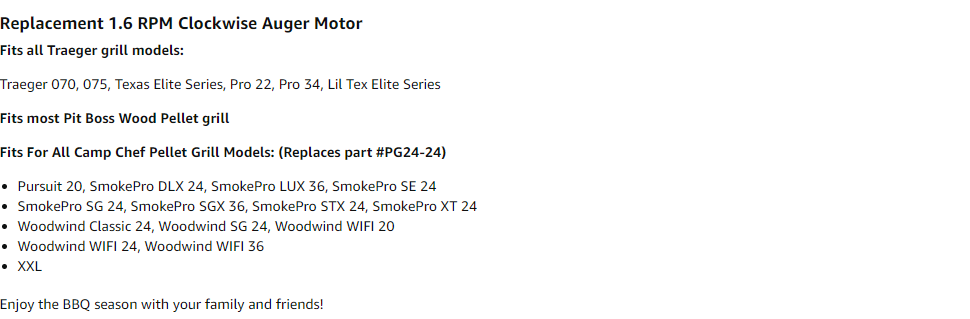 This Auger Motor helps power the auger which moves the pellets from the hopper to the firepot during cooking, with the rotation of 1.6 RPM. (Stock available in US Warehouse)